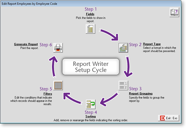 From the report selection screen, highlight the report that you wish to alter, then click the Edit button. The Report Writer Setup Cycle appears: