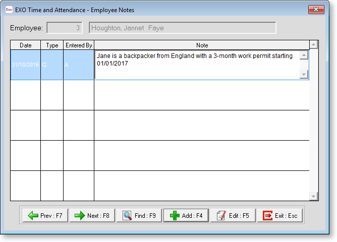 Notes can be entered or edited by clicking the Notes button of the Employees window, by selecting Notes from the File menu or by pressing the F12 key at any time. In the latter two cases, you must select an employee before the Notes window is displayed.