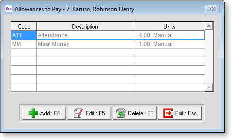 To do this select this button and then enter on Add in the next screen. You will be presented with a list of the Exo Time and Attendance Allowances from which you can choose the required Allowance. Allowances can only be added one at a time in this way.