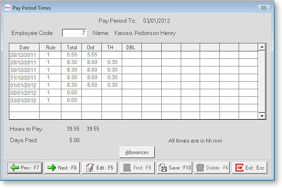 Once you have made the required changes to this employee you can return to the Time Cycle by clicking Save or pressing F10, then pressing esc to close the pay period times screen. Alternatively, you can move on to the next or previous employee by pressing F7 or F8.