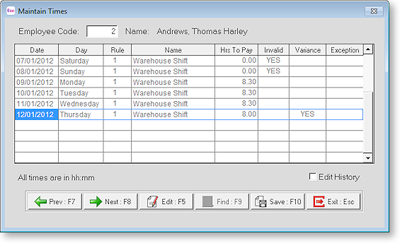To correct this, select the line that needs to be changed and click Edit. Enter the correct time and click Save. Then de-select the Times are Invalid option to make the day valid.