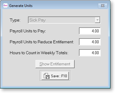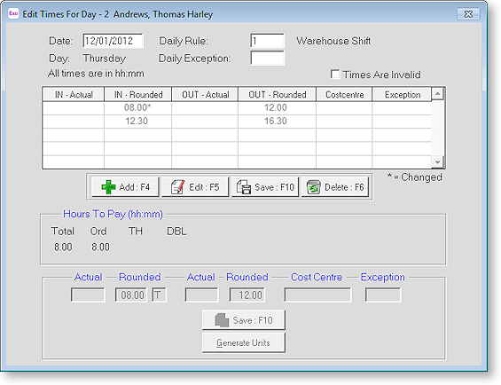 To correct this, click the Add button to add a new line. Enter the correct times if you want to record the actual times the employee was absent; otherwise leave it as 00:00 and 00:00. Enter the Exception code for a part day Holiday, Sick leave etc. into the Exception field. When you do this, the Generate Units button becomes available. Click this button and enter the number of Hours or Days you want to pay.