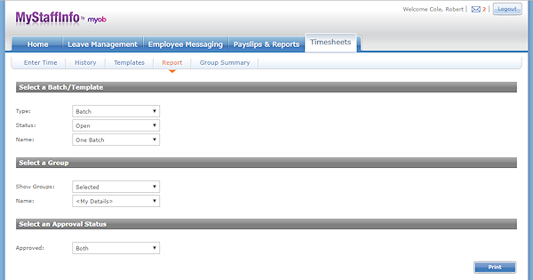 Reports detailing timesheet batches and/or templates can be produced from the Report page.
