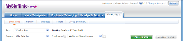 The Timesheets function is an optional add-on to MyStaffInfo. If you require collation, approval and import of timesheets from the website to Exo Payroll, please consult the Helpdesk.