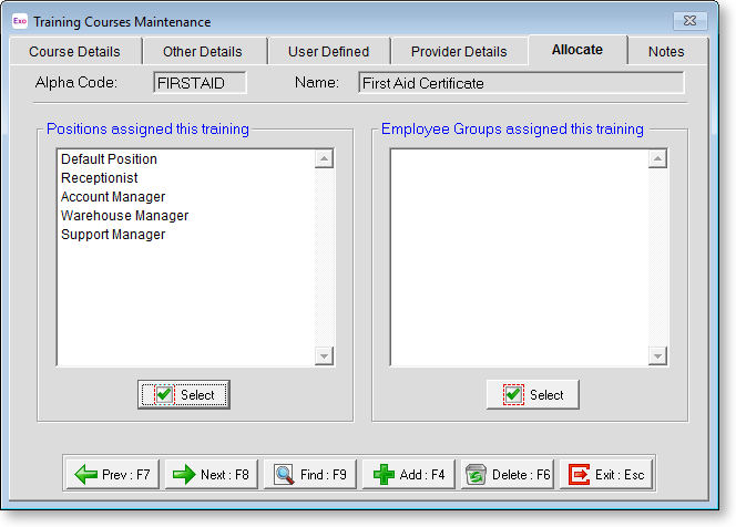 To assign the training course to positions and/or Employee Groups, click the Select button in the appropriate area, which displays the available positions/groups: