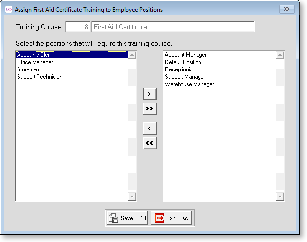 All unassigned positions/groups are listed on the left; all positions/groups that the training course is assigned to are listed on the right. You can click on items and drag them from one list to the other.
