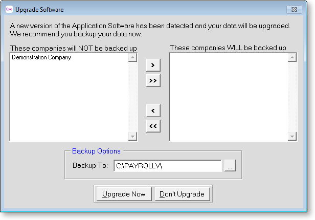 When you restart Exo Payroll, the upgrade process for your company files will begin automatically. The Upgrade Software window appears, prompting you to specify which companies you want to back up during the upgrade process.