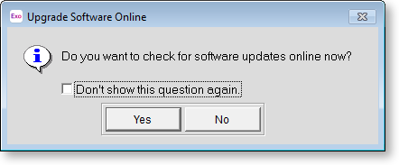 From within Exo Time and Attendance you can check if any updates are available online, and if so, download and install them immediately. Select Upgrade Software Online from the Help menu. The following window is displayed: