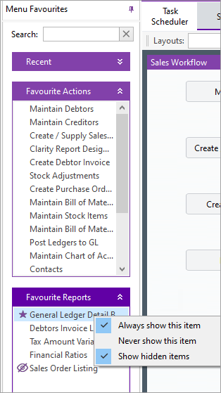 - To hide the menu favourites sidebar, click the pin icon at the top right.