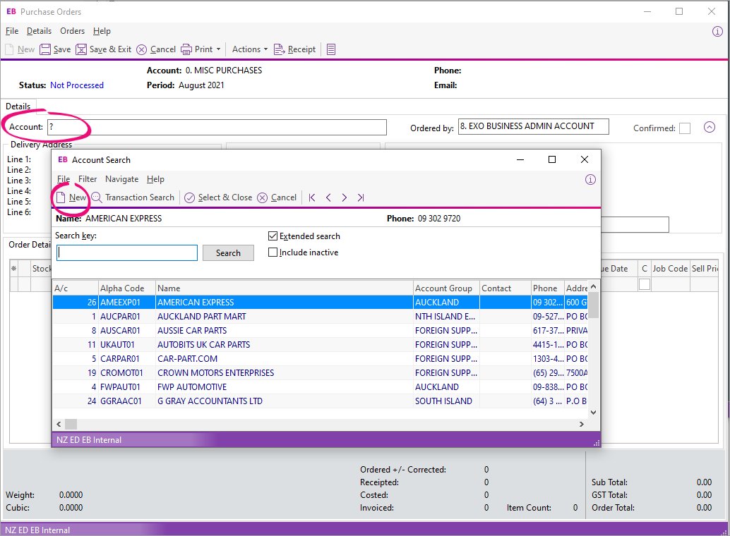 You might experience this error, 'Access Violation at address 028EACA5 in module 'exonet.exe'. Read of address 000000008', when creating a creditor from the Purchase Orders screen, entering ? in the Account field, then clicking New in the Account Search window.