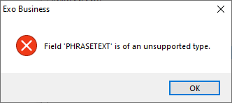 Error: "Field 'PHRASETEXT' is of an unsupported type" when using common phrases (Fixed in 2024 releases)