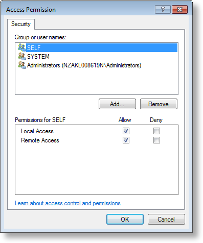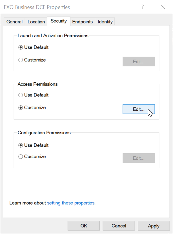 Access permissions must be for the server DCOM objects so the client computers can access the middleware server. Launch and Configuration permissions should be left as default as they are not used when the Exo Business DCE is run as a service. - In the Access Permissions group, select Customize and click the Edit.. button.