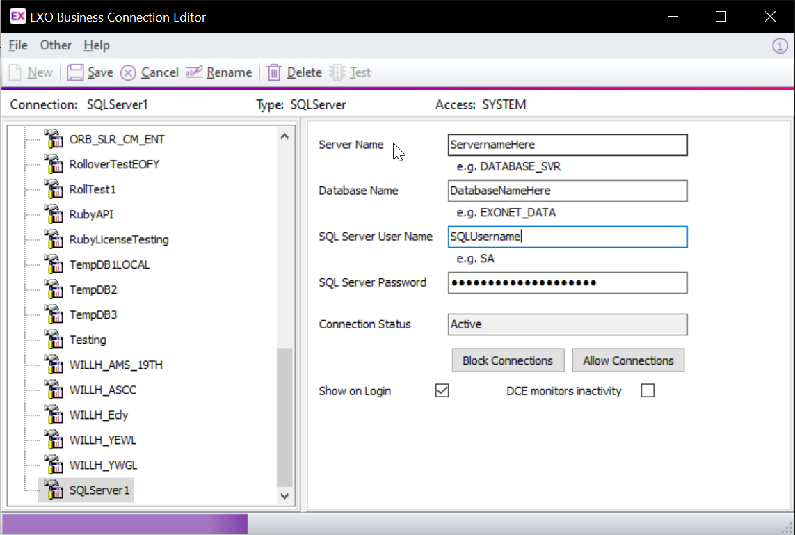 - The usual Exo Business Connection Editor will appear. Add a connection configured to your server: