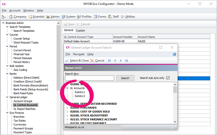 In the MYOB Exo Configurator, you might encounter an issue when selecting general accounts for a control type: the General Ledger Account Search window lists a GL account template. This template isn't a real account and shouldn't be included in the list.