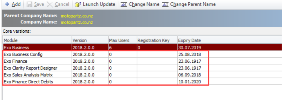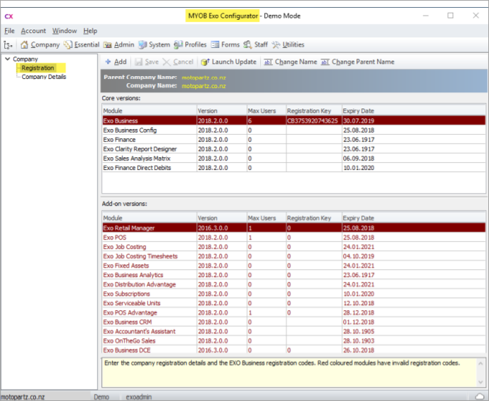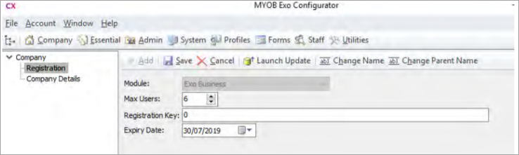 MYOB Exo Business installations require companies and modules to be registered with licence codes. These licences need to be renewed once a year.
