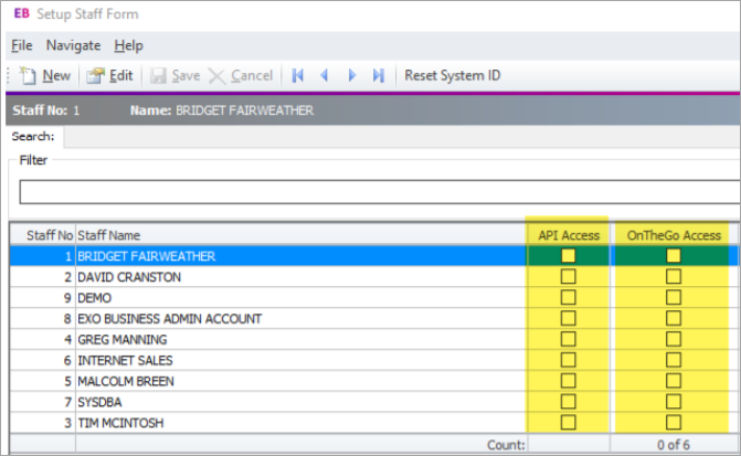From the above screen, you can at a glance identify the staff linked to either API access.