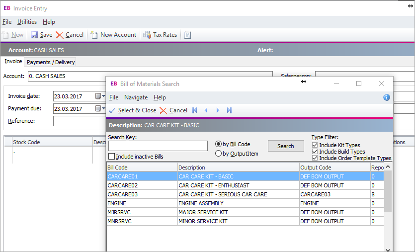 On the Sales Orders and Debtor Invoice screens, there's a quick way to open the Bill of Materials Search window.