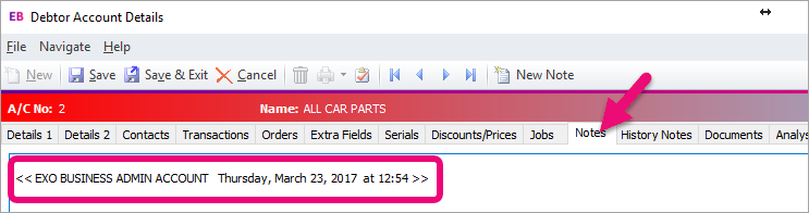 It can be useful to know when someone has been working in MYOB Exo. That's why there's a quick way to record your details to the Notes tab. This works on most pages—for example, the Debtor, Creditor, Stock and Contact Notes, History Notes, Job Description and Job Notes screens.