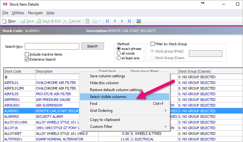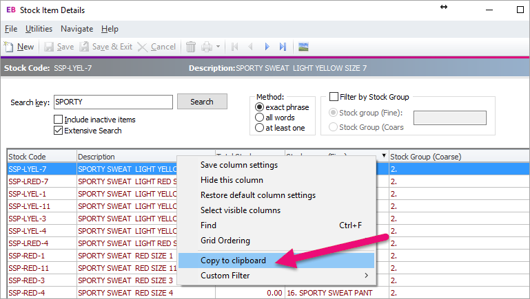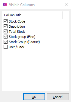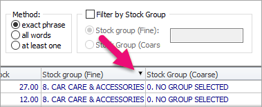 You can use columns to change the order of data listed on a screen. Simply click the column header you want to order by. For example, the data in the screenshot below is ordered by Stock Group (Fine), as shown by the black arrow in the column header.