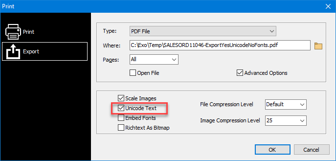 This is off by default, as turning it on significantly increases the size of all PDFs generated by Exo Business. (Adds around 200kb for a basic report) .
