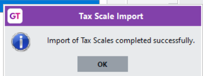 After clicking either Yes or No, the message Import of Tax Scales completed successfully displays.