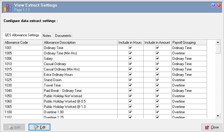 For each allowance, you will need to specify whether it is included in the Hours and/or included in the Amount, and which Payroll Grouping it should be included in.