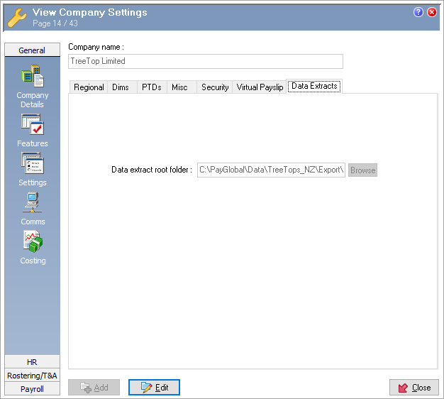 To run a data extract, PayGlobal first requires a root folder path to be specified. This is catered for by a new field called Data extract root folder within Company Settings (go to: Administration > Modify Company Settings > General > Settings > Data Extracts tab):