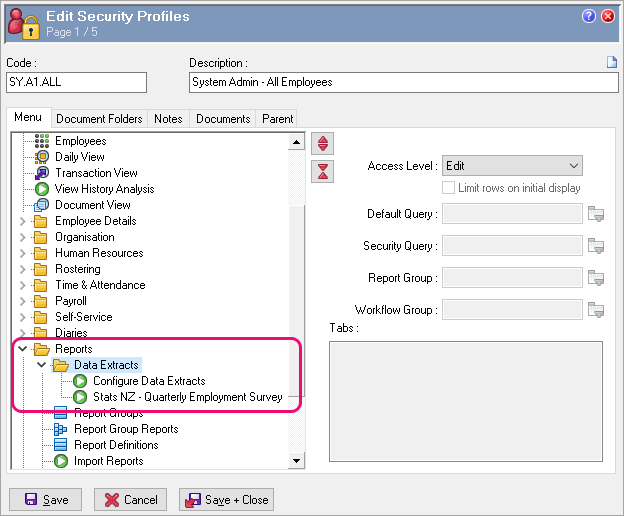 Access to the Data Extracts is controlled via the user’s Security profile. To ensure you control which users should have access, access to the run commands within the Data Extracts folder will be switched off by default.