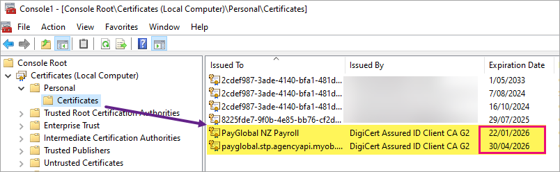 Your IT team can check the expiry of the installed certificate through Microsoft’s MMC console ‘Certificates’ snap in. The certificate is installed on all PayGlobal users' computers where HR.exe runs (IT can confirm this with Task Manager).