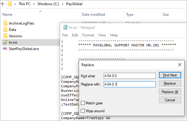 Relating to note above, if you are not updating LIVE and your HR.ini contains both LIVE and TEST company data sections - Please ensure you don’t change the LIVE Run_Version in HR.ini. I.e. don’t replace all instances of “4.64.0.0” to “4.64.0.1”. Manually make the changes to HR.ini.