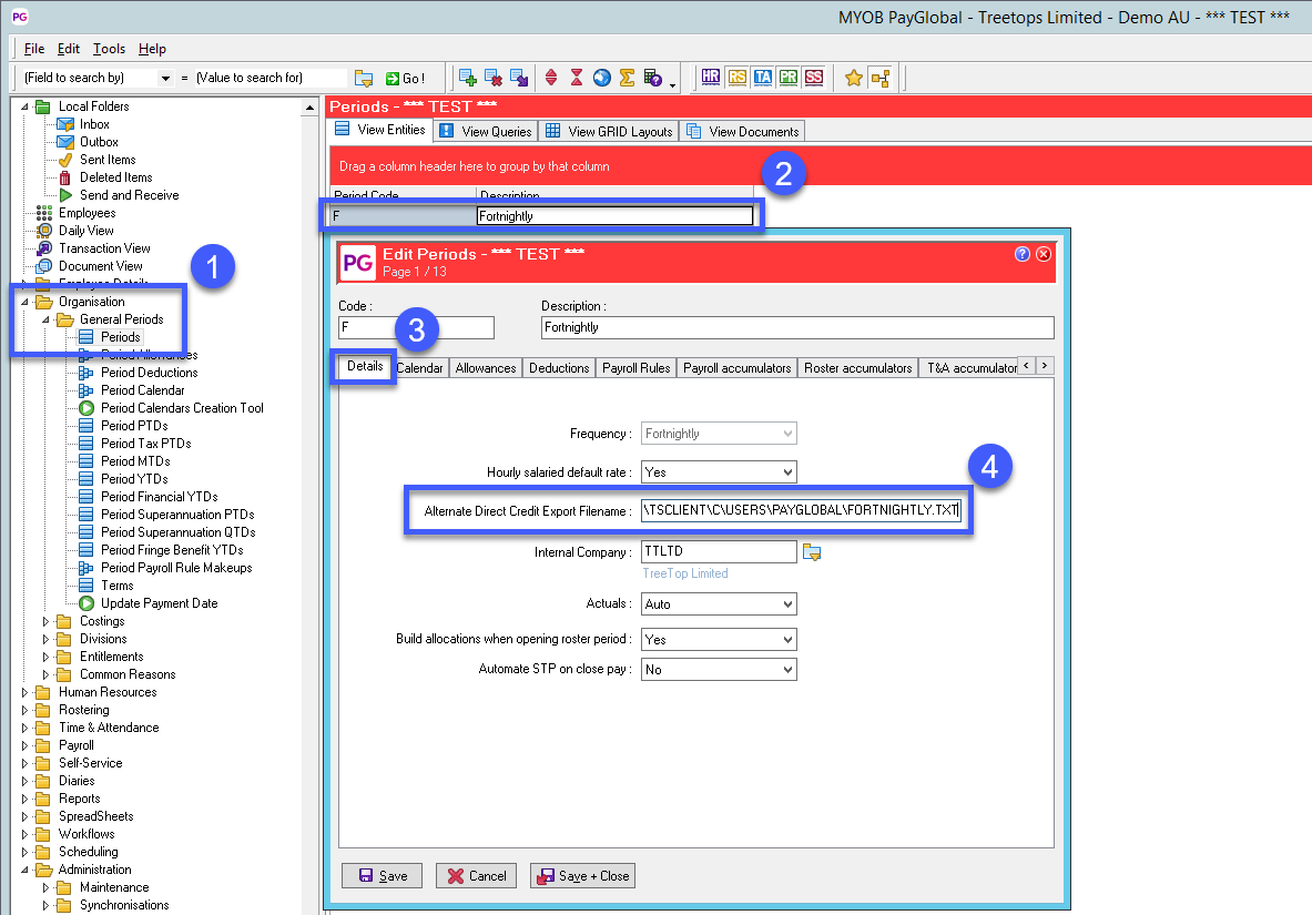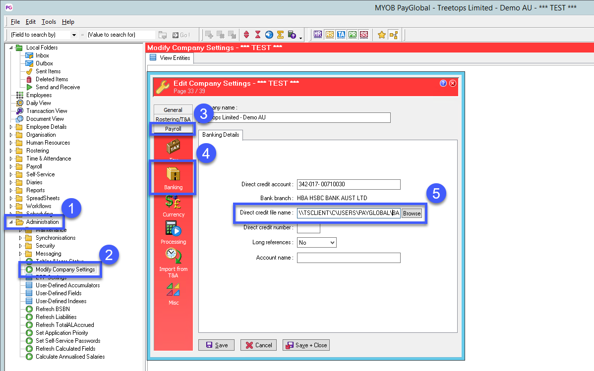- In the Alternative direct credit export file name enter in the path you want the If this location is blank PayGlobal defaults to the location under Modify Company Settings.