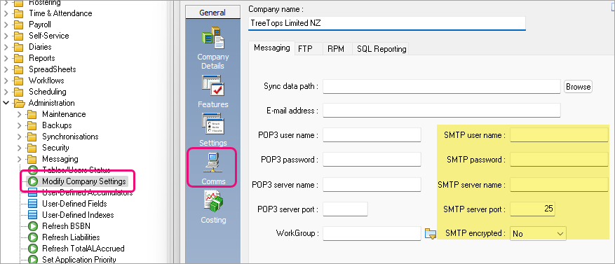 To continue sending emails from company domain (e.g. @myob.com) and stay DMARC compliant, you can change the mail server in PayGlobal Company Settings to use your company’s mail server. The information can be sourced from your IT/Mail Server Administrator and is input in General | Comms | Messaging tab.