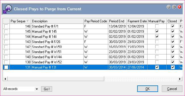 Limitation: The Pay Period Calculation Listing, Employee Payslip Report and some other transaction reports (those prefixed PGPRTRAN) are designed to use data from the “Current” transaction tables only, i.e. purged pays do not show in the pay sequence selection list.