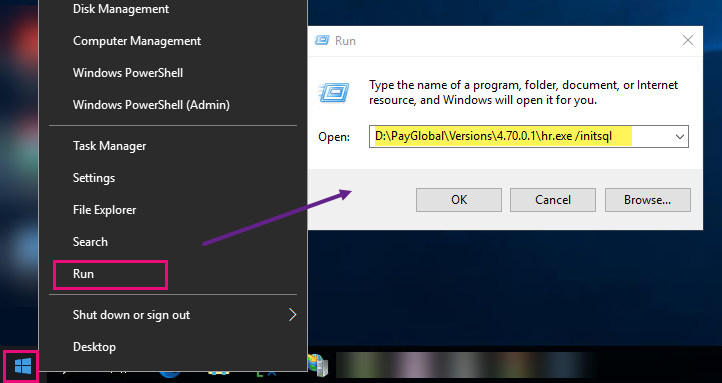 - After Hr.exe, type a space, and then type /initsql and click OK. For example: