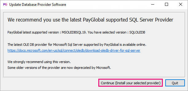 - If you don't select the latest SQL OLE DB provider available, a prompt will appear advising you of the latest available. Click Continue. Note: If you prefer to install the latest SQL OLE DB Provider, click Quit to do so before starting secure process again from step 1.