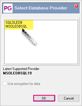 - At the Select Database Provider prompt, select the SQL OLD DB provider you have installed and click Ok.
