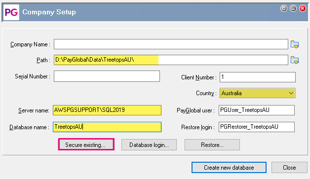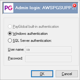 - PayGlobal user– By default this is PGUser_[Database Name]. The PayGlobal user must be unique to each database. If the SQL Server uses Windows Authentication, you can leave the PayGlobal user field blank.