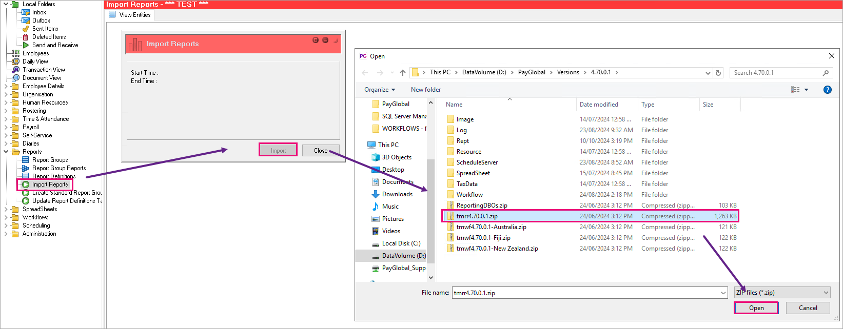 When you installed the new version of PayGlobal, the Installation Wizard copied a Report catalogue (tmrr.zip) to the PayGlobal executable folder. You now need to import the new report catalogue into your new database.