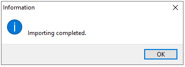 The Import Reports box is displayed. PayGlobal extracts the reports from the ZIP file to the Rept folder in the executable folder. The following Information message is displayed: Importing completed.