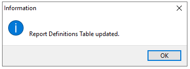Double-click Update Report Definitions Table. The following Information message is displayed: Report Definitions Table updated.