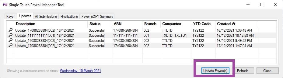 PayGlobal supports reporting of previous BMS IDs and Payroll IDs via the Updates tab in the STP Manager Tool. The Updates tab has new button called Update Payee(s).