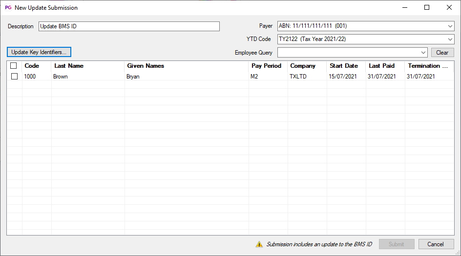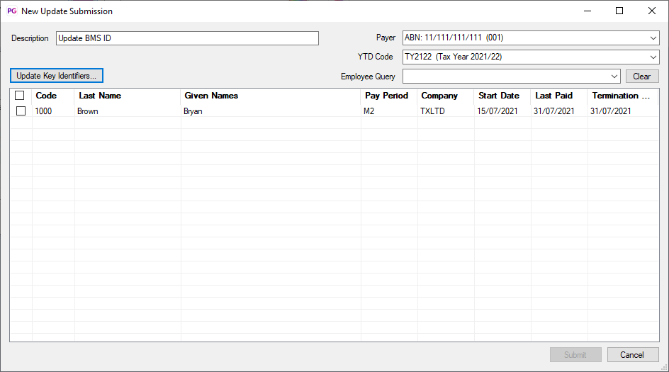 - Click OK. The Update Key Identifiers form will close and you will be returned to the New Update Submission page. You will also be able to the employee's previous payroll ID from the import file if you have this column displayed. The Submit button will still be disabled.