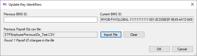 - Select the required file and click Open. You will be returned to the Update Key Identifiers form. The form will show how many employees will have Previous Payroll IDs reported.