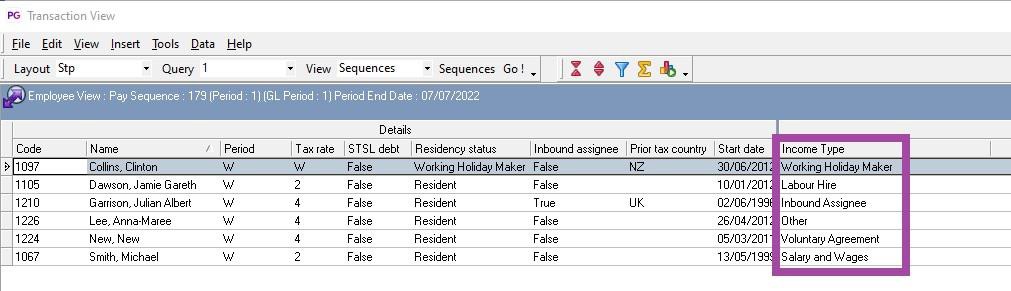 Income type is a field that can be added to Transaction View via the Customise Columns feature. The system derived income type is visible after processing a pay.