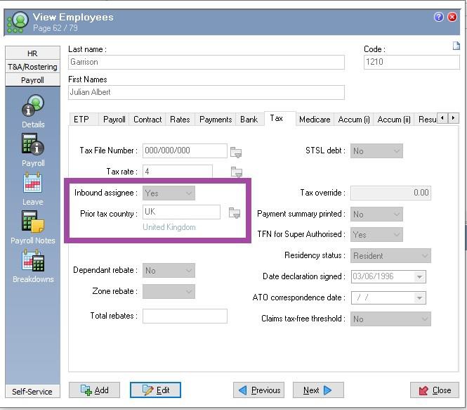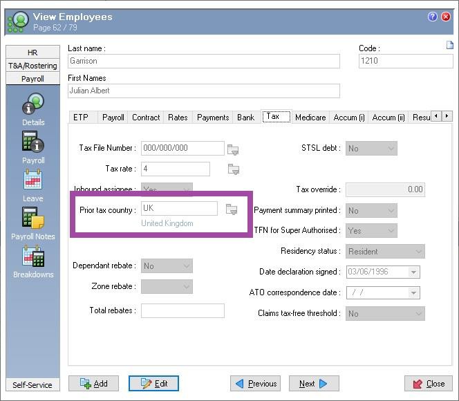 - Prior tax country: If your organisation has employees defined as an Inbound Assignees to Australia (IAA) or Working Holiday Maker (WHM). You must also set the Prior tax country field – See Countrycodes for more details.