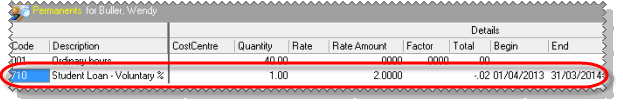 In this example, Wendy Buller already makes standard student loan repayments and she wants to make an additional voluntary repayment of 2% per week from 01/04/2013 to 31/03/2014.
