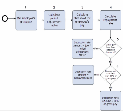If the repayment rate (Step 4) is less than 20% of the gross pay (Step 1): Deduction rate amount = Repayment rate (Step 4) If the repayment rate (Step 4) is greater than or equal to 20% of the gross pay (Step 1): Deduction rate amount = 20% of gross pay (Step 1)